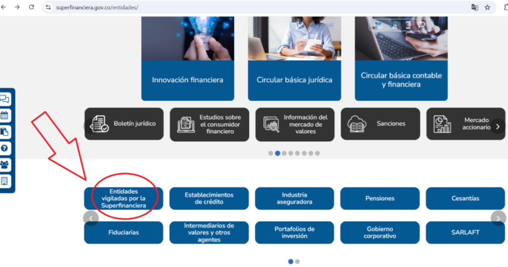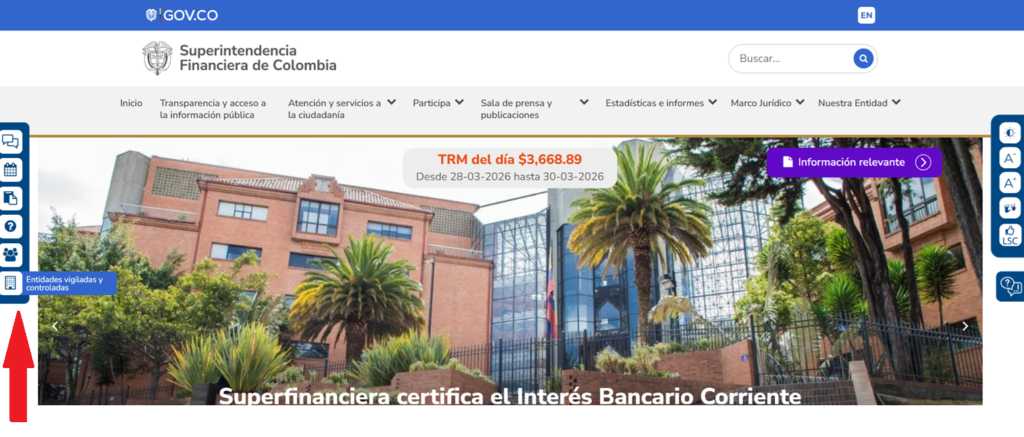 Ingrese a la página principal de la Superintendencia Financiera de Colombia https://www.superfinanciera.gov.co/ y luego diríjase al menú de la parte izquierda y haga clic en Entidades vigiladas y controladas:
