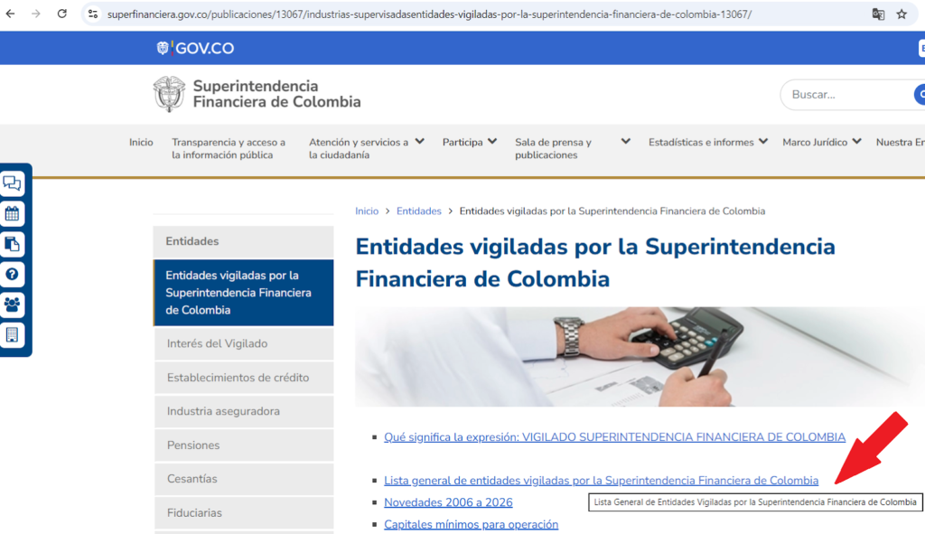 Será enviado a una nueva página y allí bajar hasta encontrar la sección de Entidades vigiladas por la Superfinanciera: